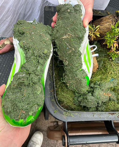 Ganz aktuell musste der Trainingsbetrieb eingestellt werden, da sich nach wenigen Sprints eine harte, klumpige Plastikmasse unter der Schuhsohle festgesetzt hatte (vgl. Foto) und ein sicheres Fortbewegen mit, aber auch ohne Ball, unmöglich machte.